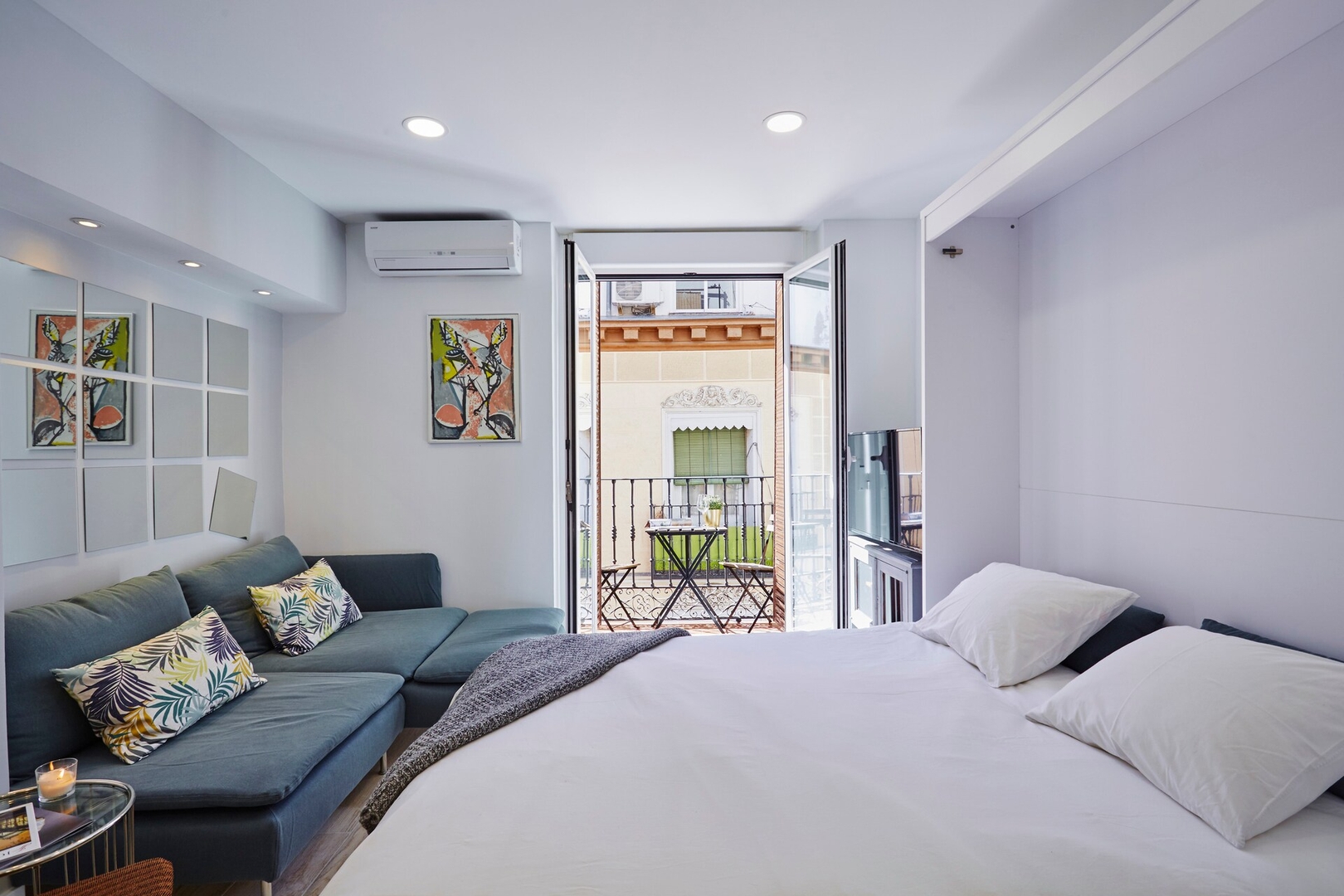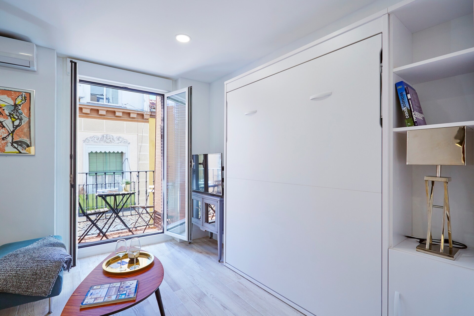 ✦ Distribución: Una cama plegable de 140 cm, con un sofá, TV y una mesa para comer o usar como espacio de trabajo, con Wi-Fi, AC, calefacción y un armario con ganchos.