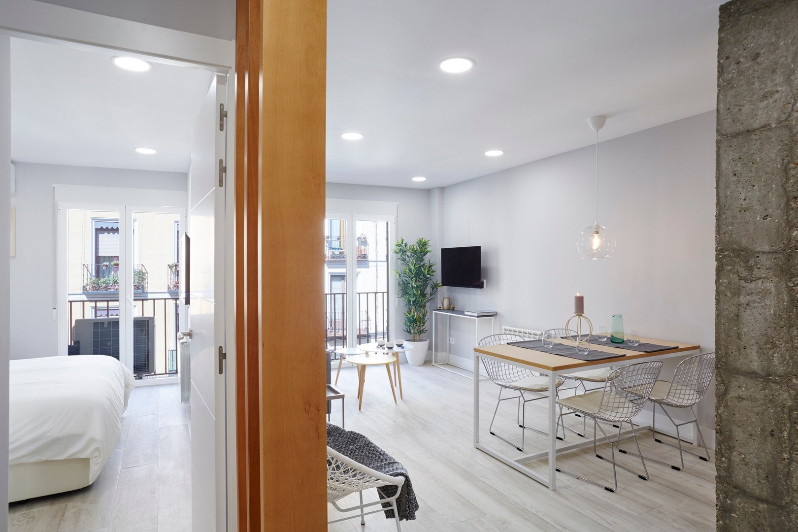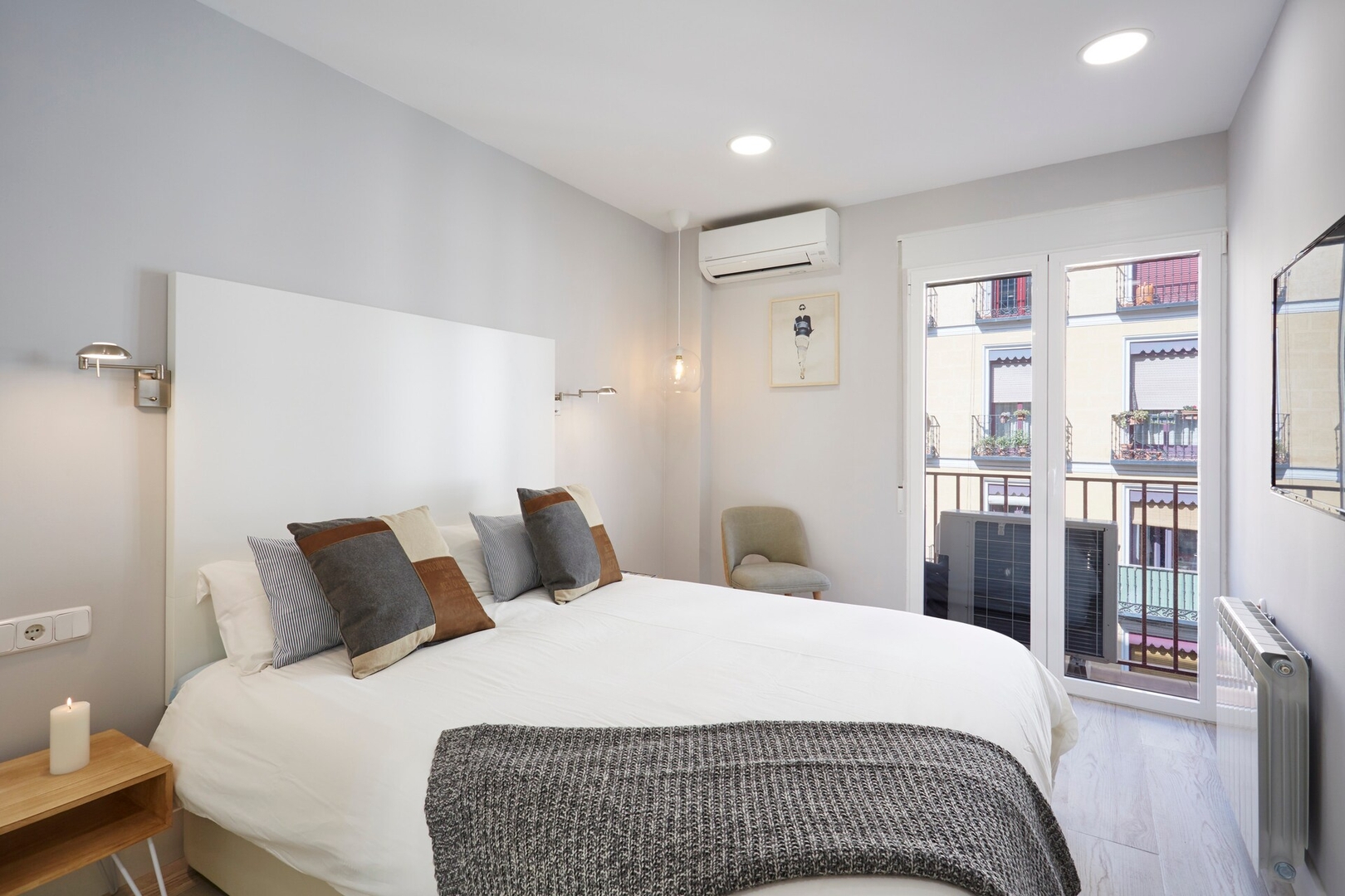 ✦ Distribución: Una cama de 140 cm y una cama nido, con un sofá, TV y una mesa para comer o usar como espacio de trabajo, con Wi-Fi, AC, calefacción y un armario con ganchos. Podrás disfrutar de dos balcones muy agradables, uno en el salón y otro en la habitación.
