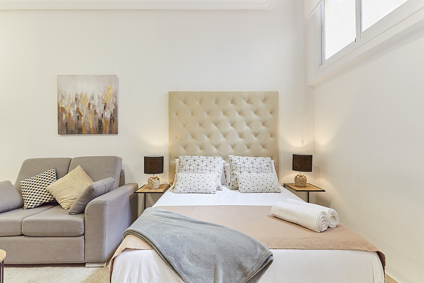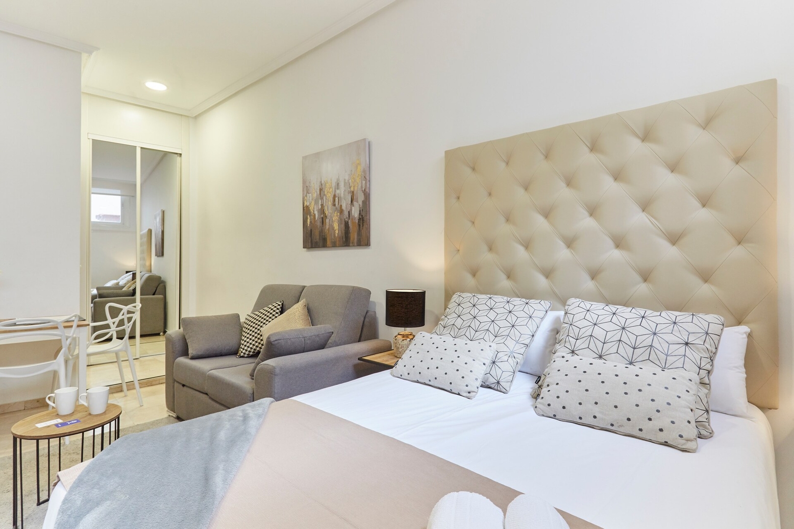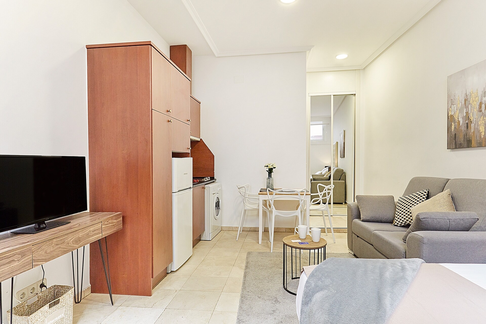 ✦ Distribución: Estudio con una cama de 140 cm, con un sofá, TV y una mesa para comer o usar como espacio de trabajo, con Wi-Fi, AC y calefacción.