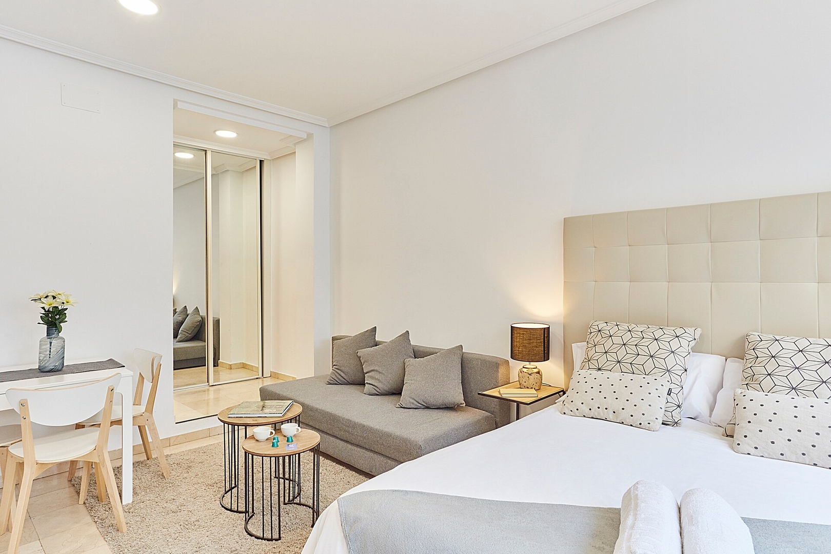 ✦ Distribución: Una cama de 140 cm, con un sofá, TV y una mesa para comer o usar como espacio de trabajo, con Wi-Fi, AC y calefacción.