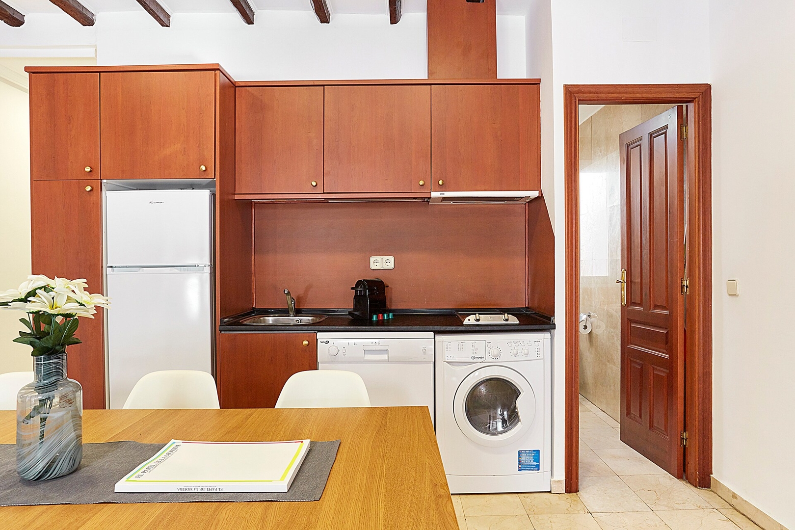 ✦ Cocina: Cocina americana equipada con todo lo necesario, incluyendo sartenes, cazos, microondas, nevera, hervidor, cafetera y lavadora-secadora.
