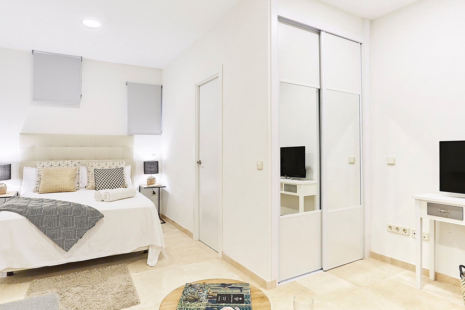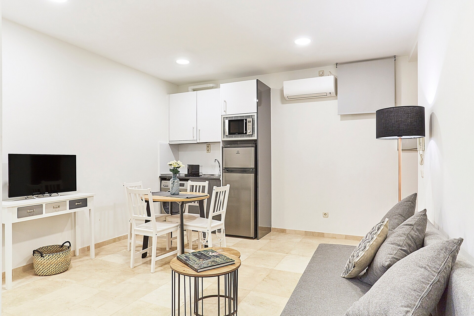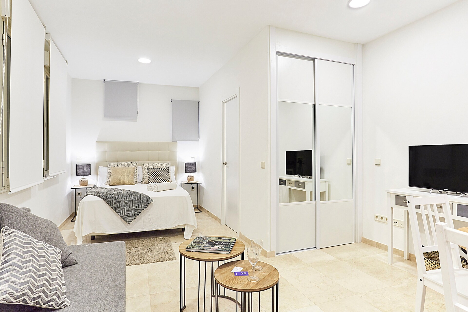 ✦ Distribución: Una cama de 140 cm, con un sofácama, TV y una mesa para comer o usar como espacio de trabajo, con Wi-Fi, AC y calefacción.