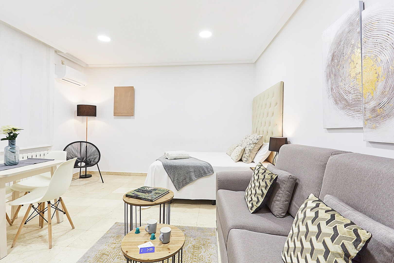 ✦ Distribución: Una cama de 140 cm, con un sofá, TV y una mesa para comer o usar como espacio de trabajo, con Wi-Fi, AC y calefacción.