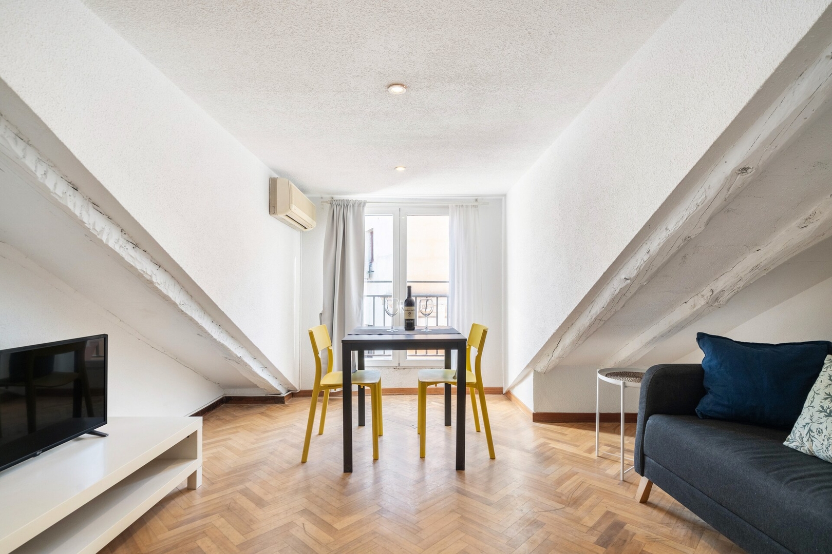 ✦ Distribución: Una cama de 140 cm, con un sofá, Smart TV y una mesa para comer o usar como espacio de trabajo, con Wi-Fi, AC, calefacción y un armario con ganchos.