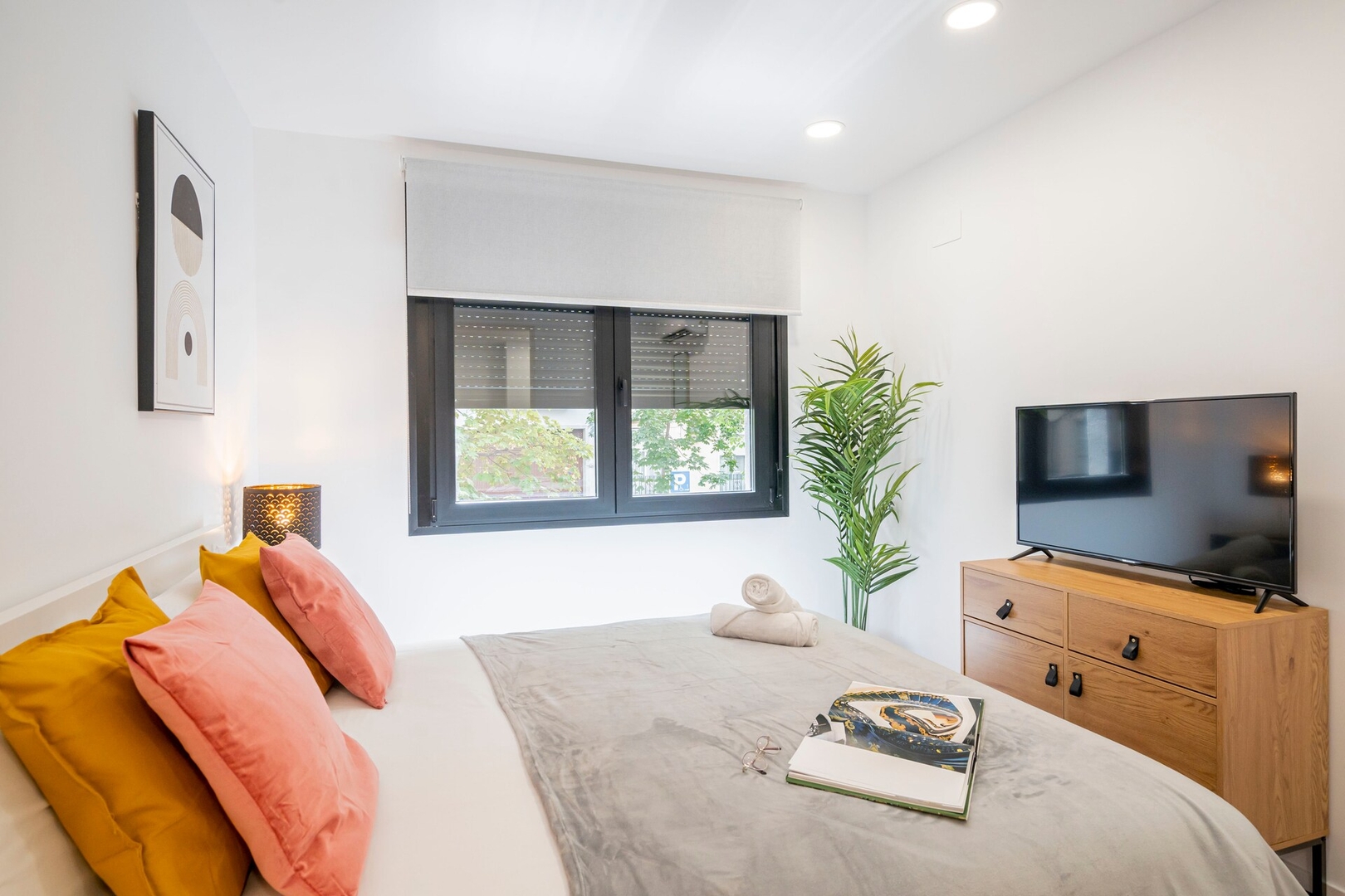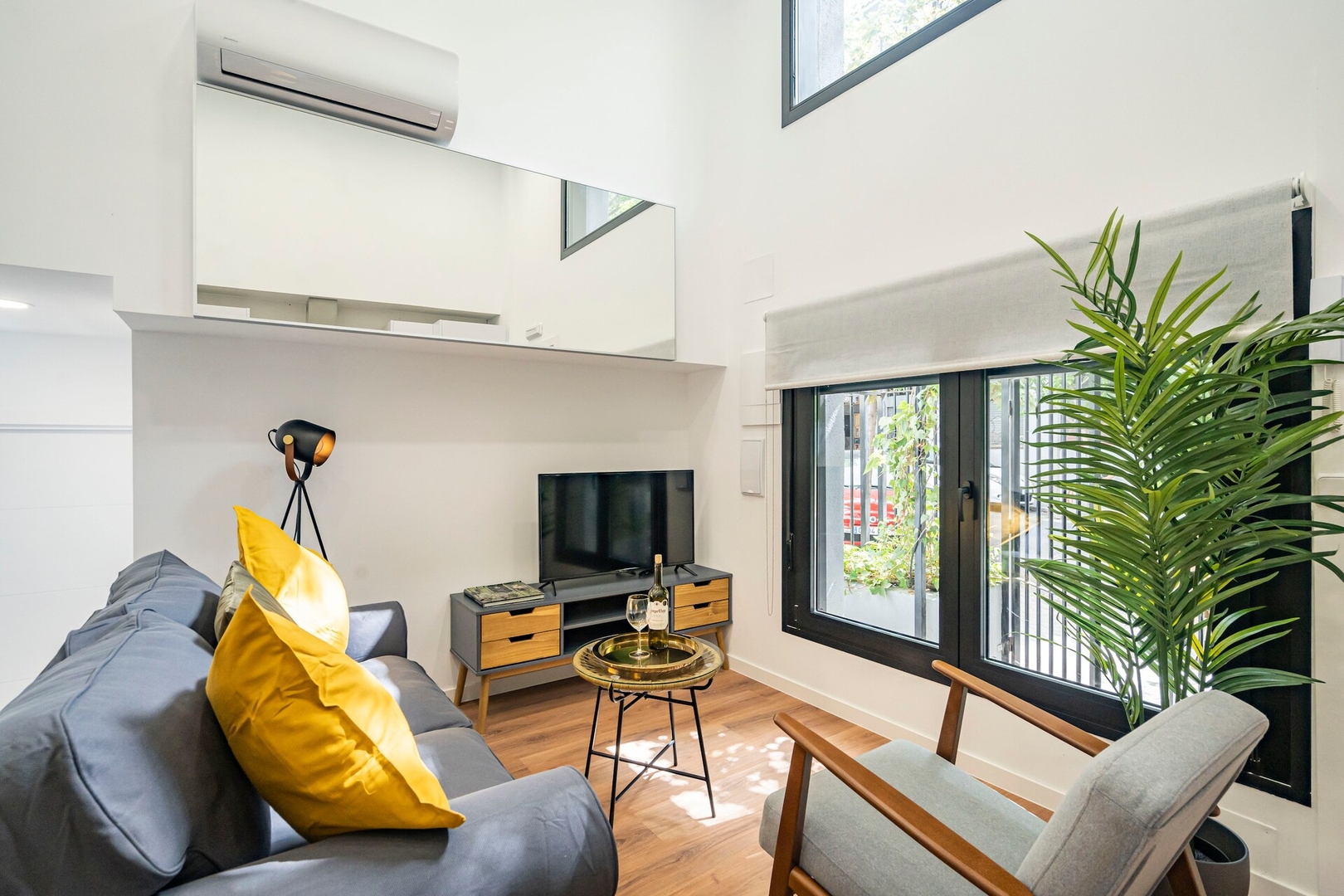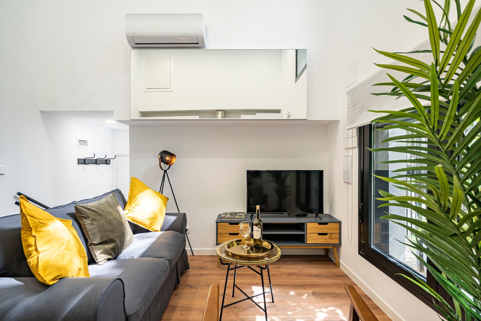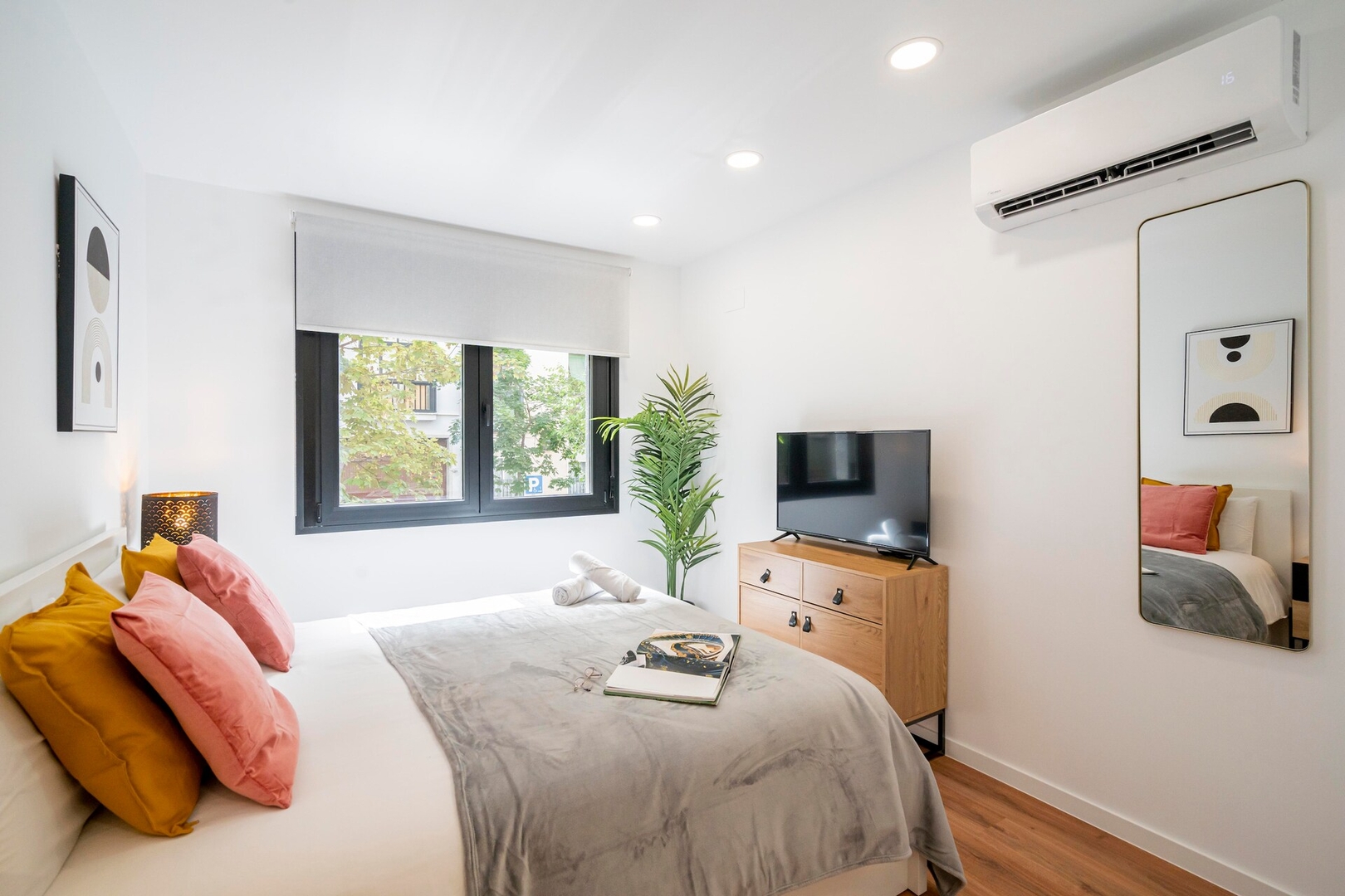 ✦ Distribución: Una cama de 140 cm, con un sofá, Smart TV y una mesa para comer o usar como espacio de trabajo, con Wi-Fi, AC, calefacción y un armario con ganchos.