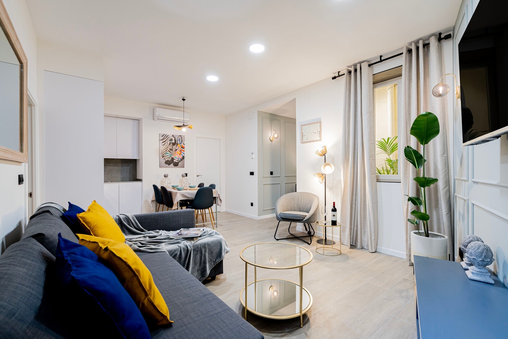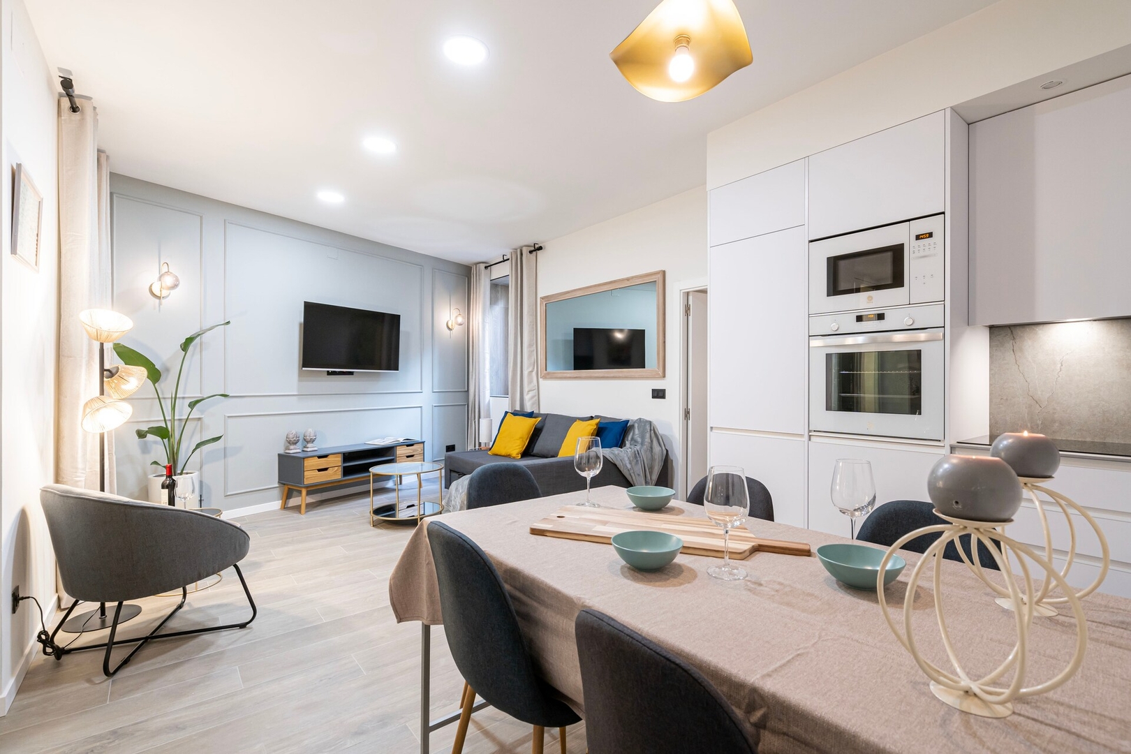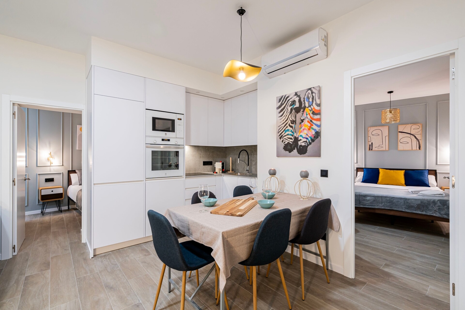✦ Distribución: Dos camas de 140 cm, con un sofácama, Smart TV y una mesa para comer o usar como espacio de trabajo, con Wi-Fi, AC, calefacción y un armario con ganchos.