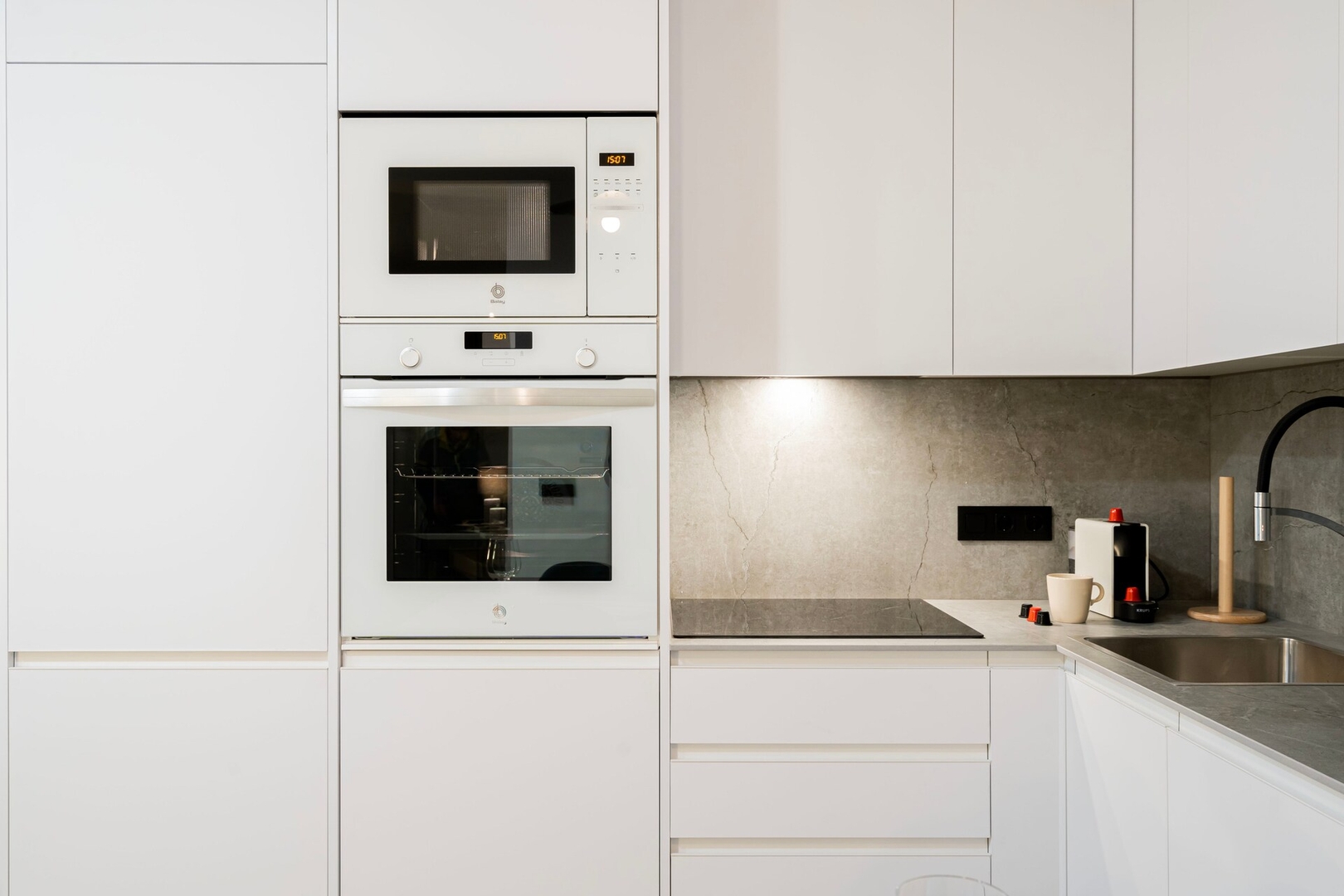 ✦ Cocina: Cocina americana equipada con todo lo necesario, incluyendo sartenes, cazos, microondas, nevera, hervidor, cafetera y lavadora-secadora.