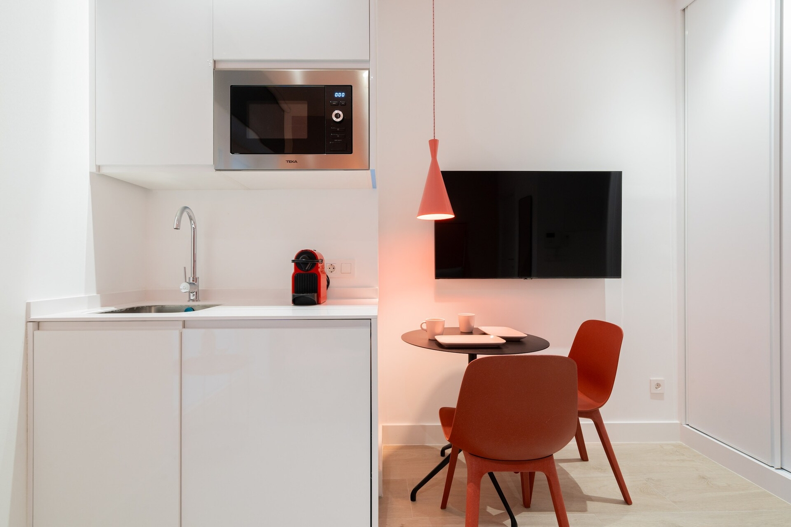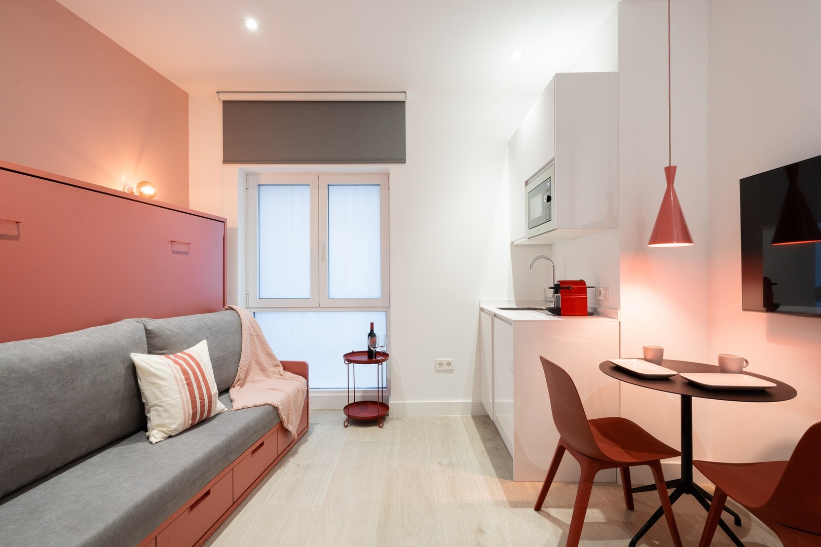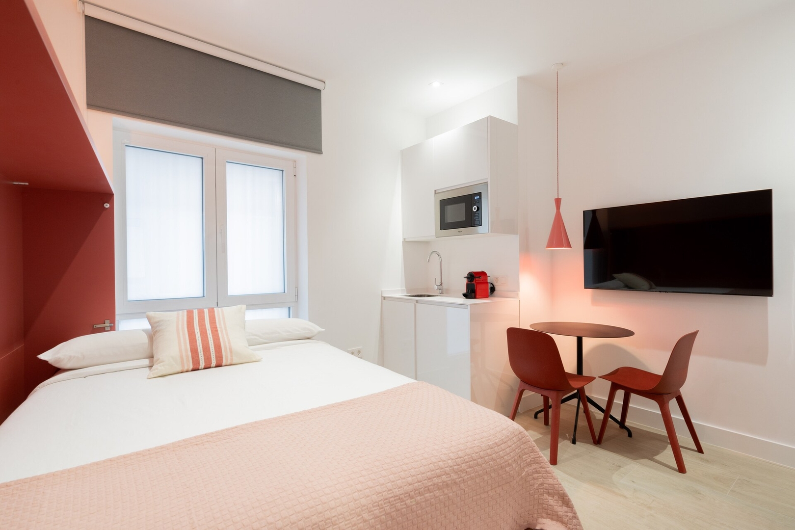 ✦ Distribución: Una cama de 140 cm, Smart TV y una mesa para comer o usar como espacio de trabajo, con Wi-Fi, AC, calefacción y un armario con ganchos.