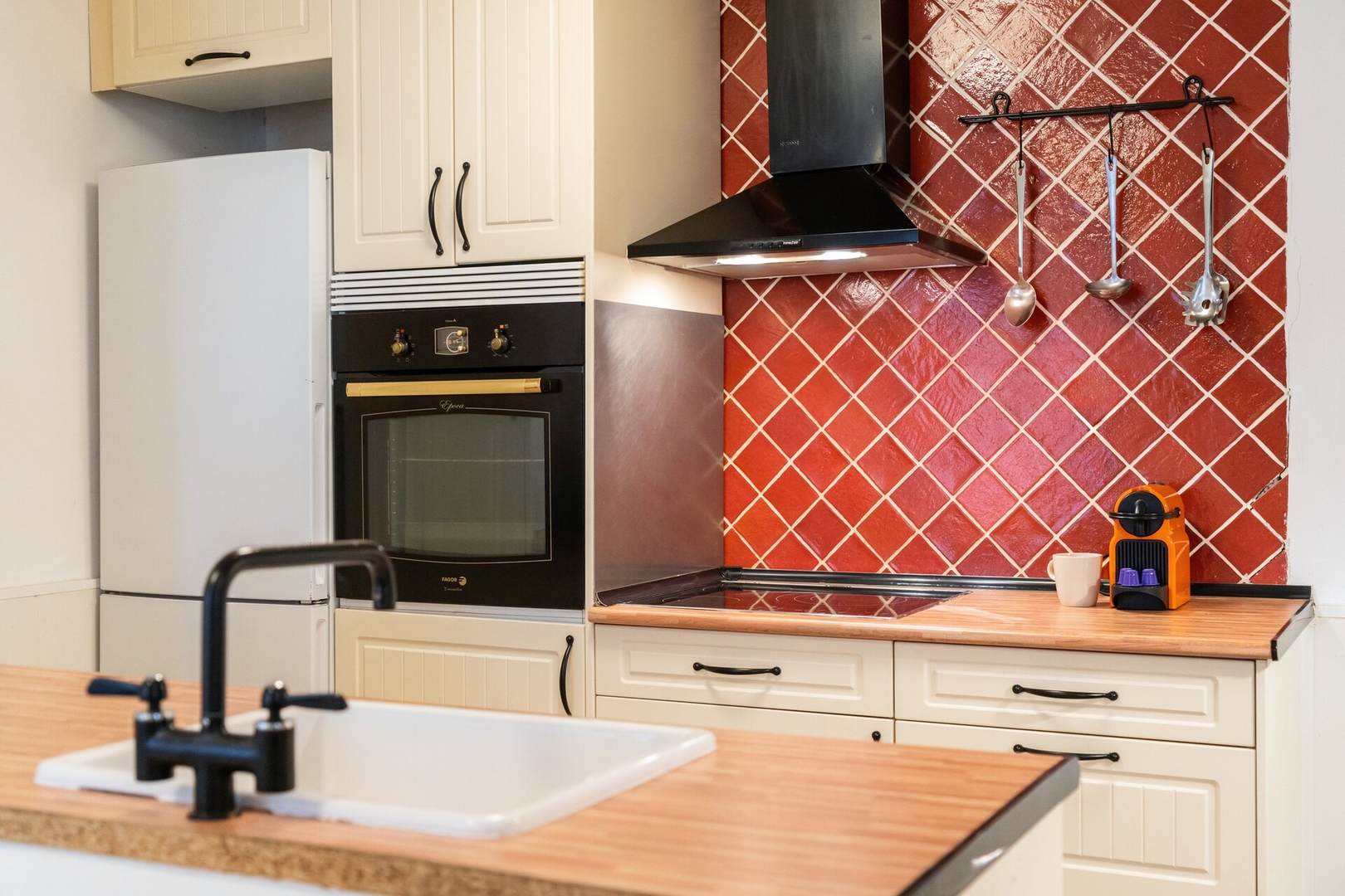 ✦ Cocina: Cocina americana equipada con todo lo necesario, incluyendo sartenes, cazos, microondas, nevera, hervidor, cafetera y lavadora.